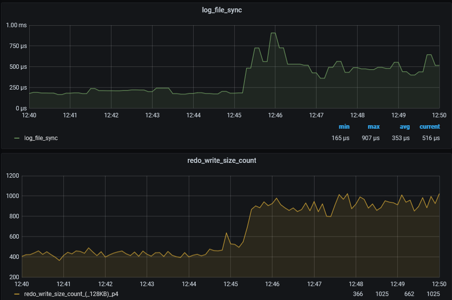 The number of waits has decreased by half, but the duration of a single log file parallel write wait (oracledb_event_p2_log_file_parallel_write_p2) has increased by an average of 50%, from 50 microseconds to 75 microseconds.