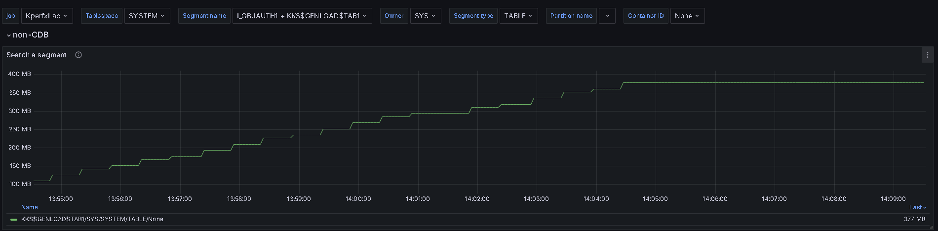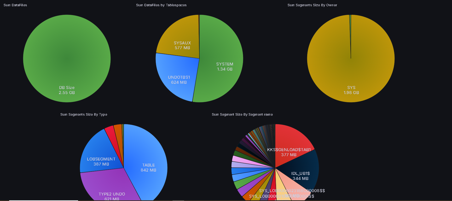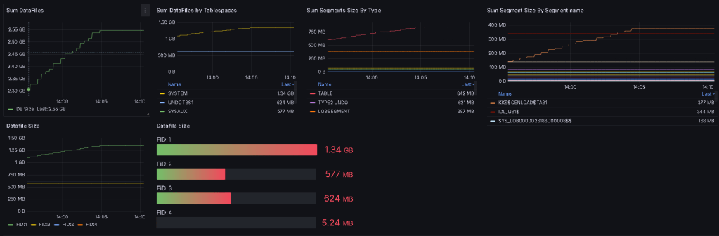 You can filter or aggregate using five parameters on the DBSIZE dashboard: labelnames=[‘TABLESPACE’,’OWNER’,’SEGMENT_NAME’,’SEGMENT_TYPE’,’PARTITION_NAME’]